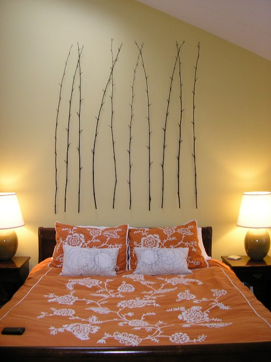 We went for horizontal sticks to de-emphasize the short ceiling height and contrast with the vertical lines of the bed frame.